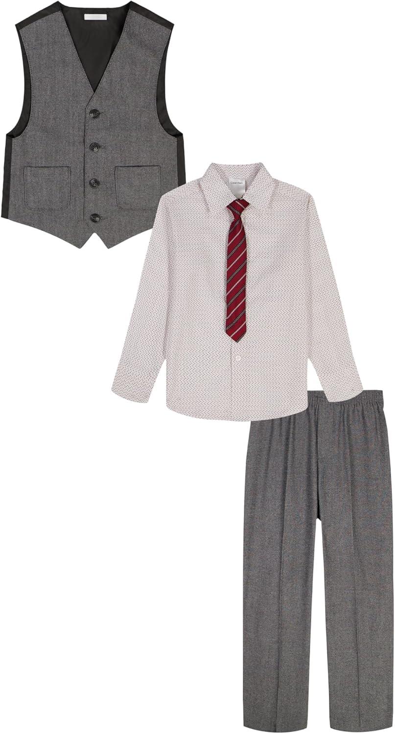 Calvin Klein Boys’ 4-Piece Formal Suit Set, Vest, Pants, Collared Dress Shirt, and Tie(Heirloom Red)