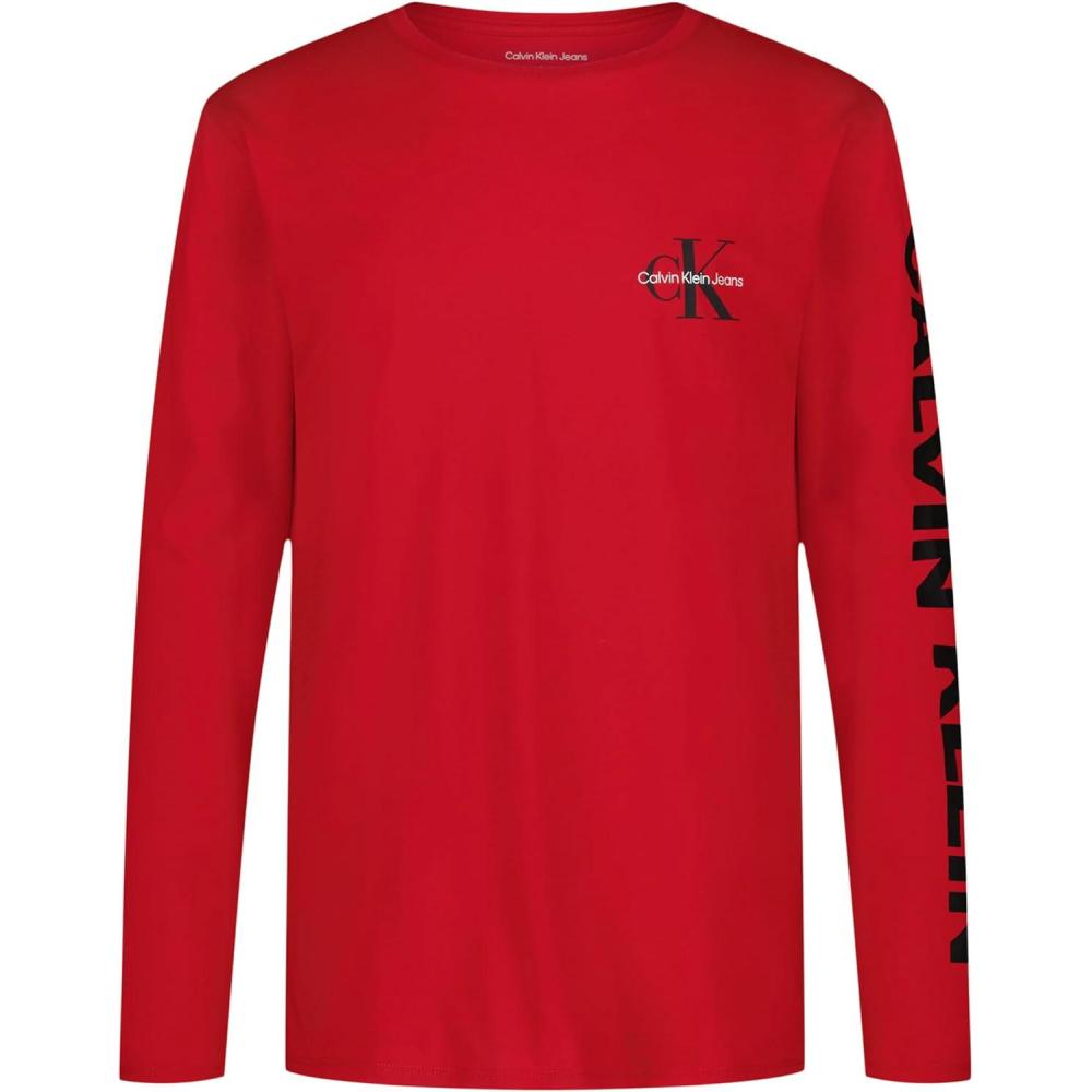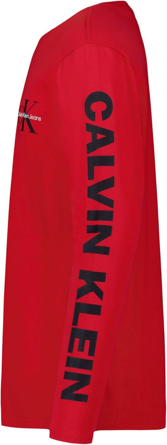 Calvin Klein Boys Long Sleeve Crew Neck T-Shirt, Soft, Comfortable, Relaxed Fit(Bold Sleeve Racing Red)