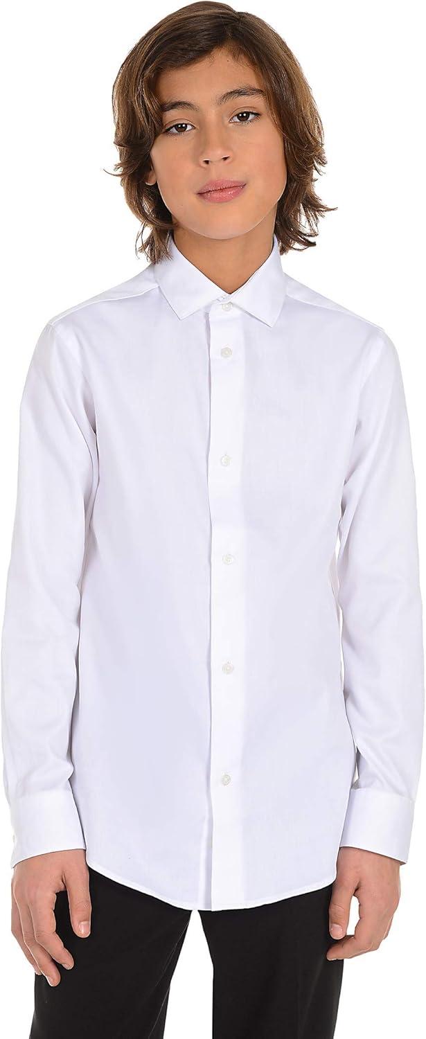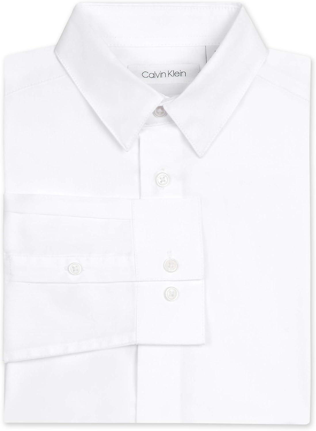 Calvin Klein Boys’ Long Sleeve Sateen Dress Shirt, Button-Down Style with Cuffs & Shirttail Hem(White)