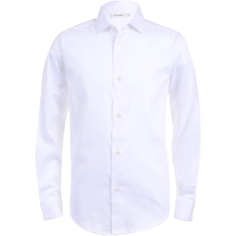 Calvin Klein Boys' Long Sleeve Sateen Dress Shirt, Button-Down Style with Cuffs & Shirttail Hem(White)